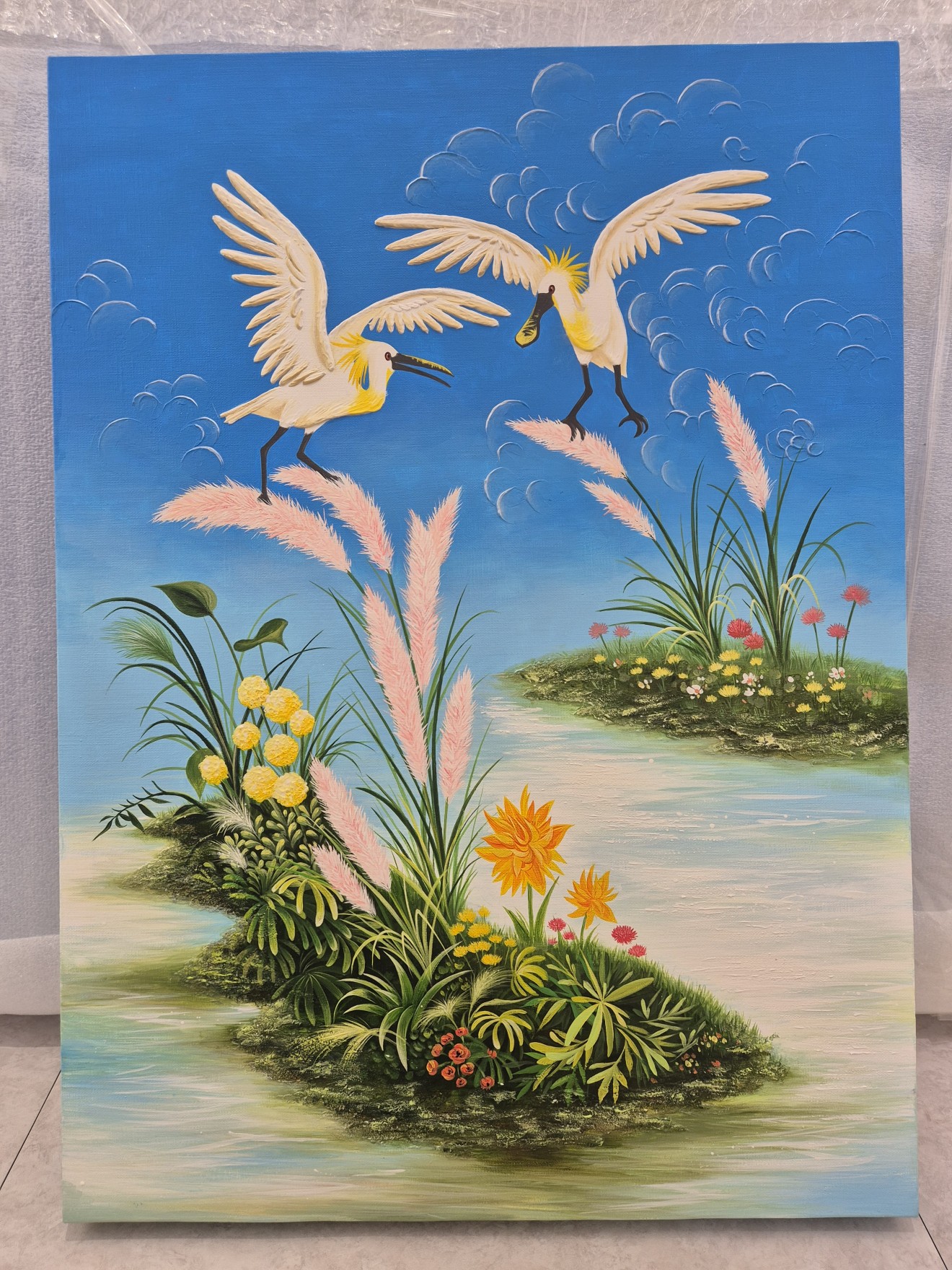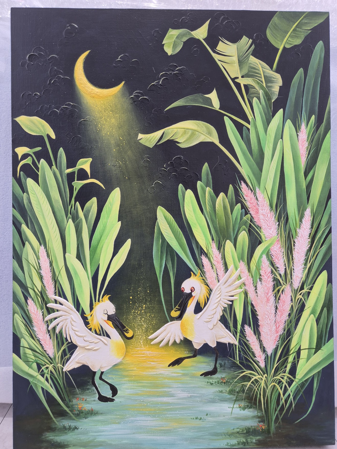 'Moonlight Night Walk' is a work depicting a scene where two yellow-billed storks meet in a forest imbued with the breath of life under the serene light of a crescent moon.