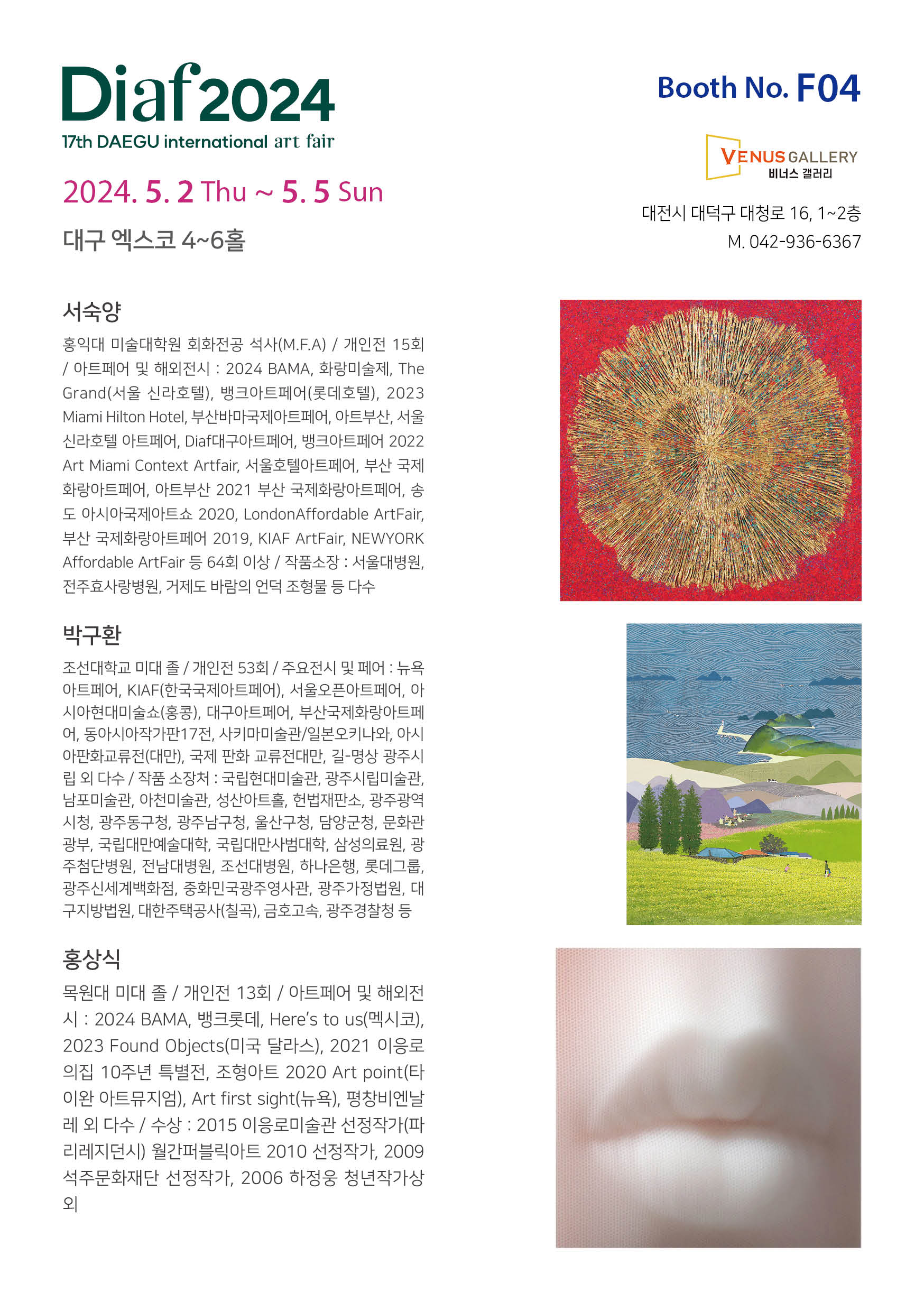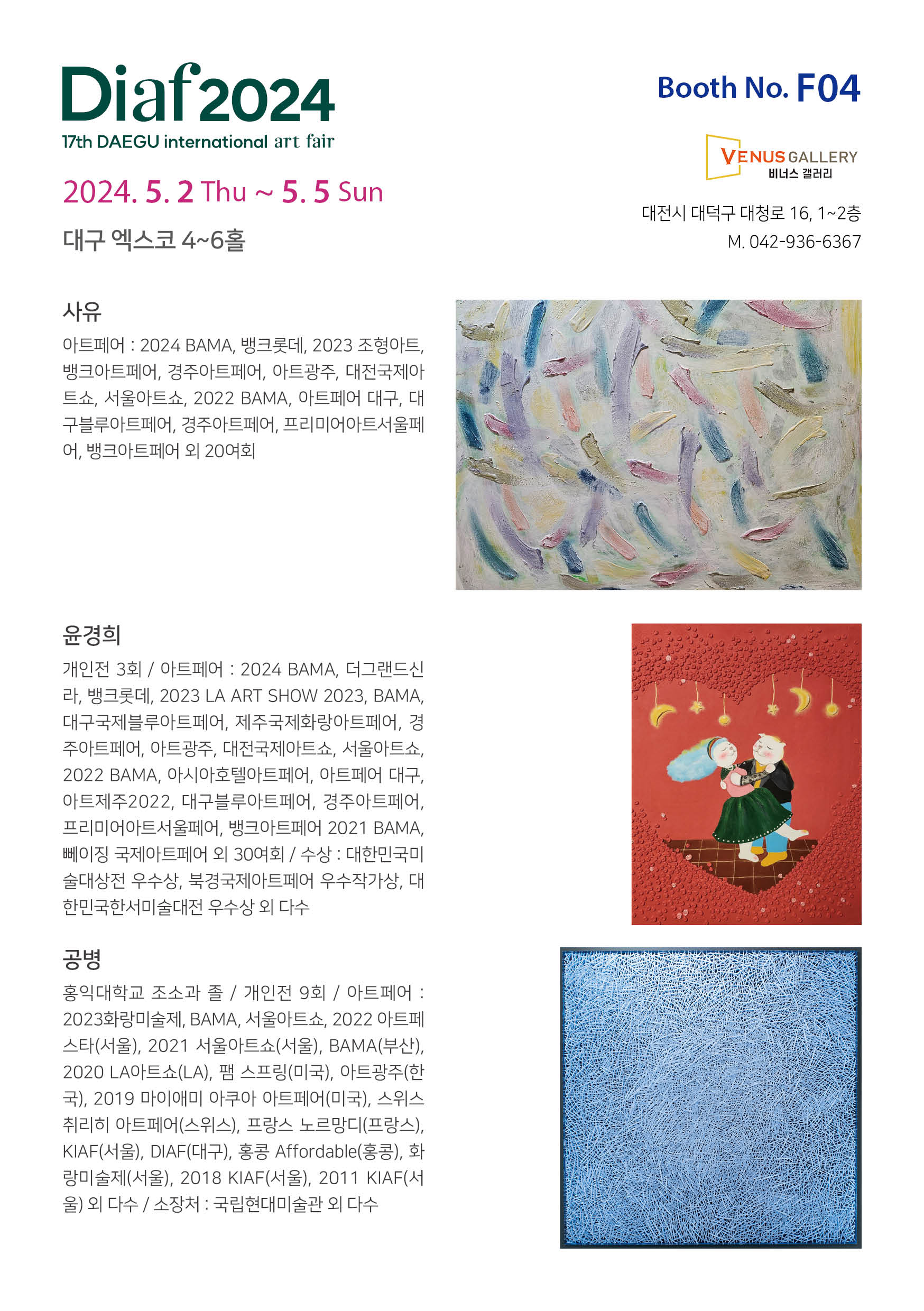 2024 DIAF(DAEGUE ARTFAIR) 본문 Artist info 2024 DIAF 김태희(KIM TAEHEE), 서숙양(SEO SOOKYANG), 사유(SAYU), 윤경희(YUN KYUNGHEE) 2024.5.2~5(EXCO)