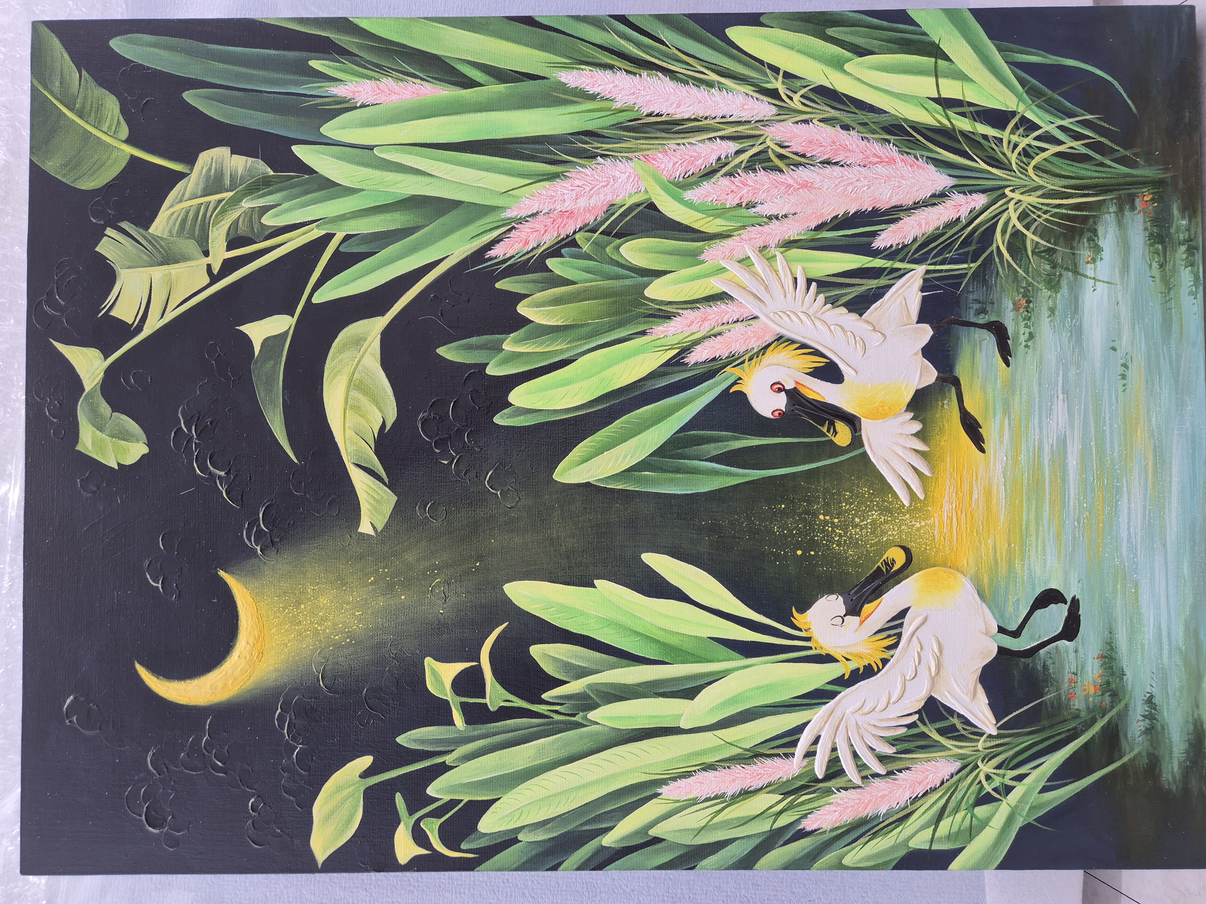 'Moonlight Night Walk' is a work depicting a scene where two yellow-billed storks meet in a forest imbued with the breath of life under the serene light of a crescent moon.